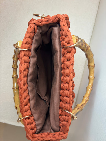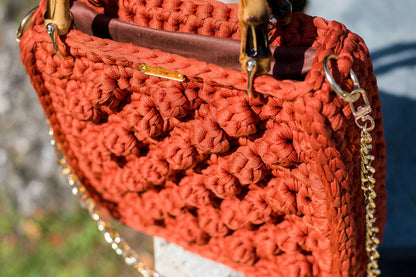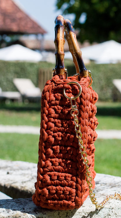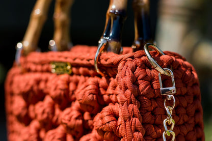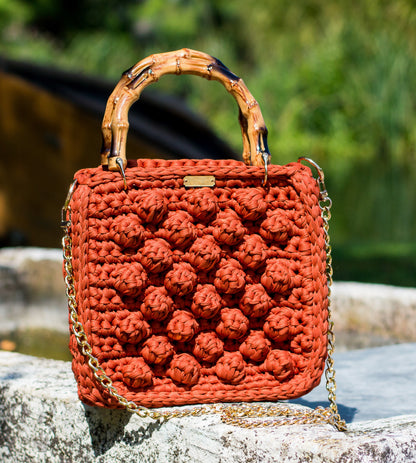 Sac Rubina en crochet au design unique, orné de poignées en bambou et d'une texture en relief façon bulles. Élégant et pratique, il peut être porté à la main ou à l'épaule grâce à sa chaîne dorée.