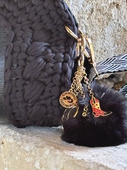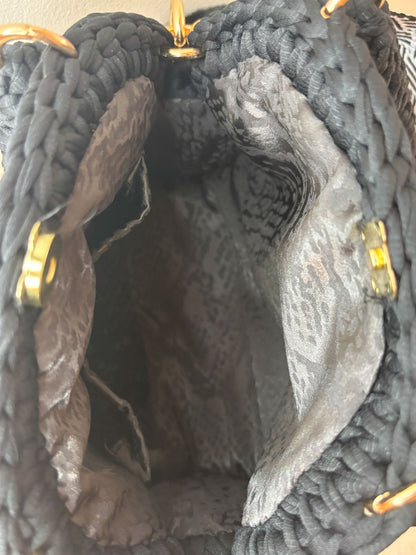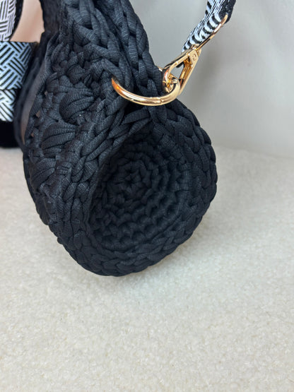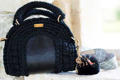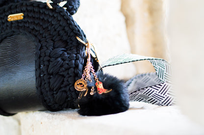 Un sac crocheté à la main, au noir profond et à la silhouette arrondie sophistiquée. Véritable pièce unique, il associe une base structurée et des détails raffinés, sublimés par un porte-clés décoratif. Un modèle exclusif, pensé pour briller lors de vos moments les plus précieux.