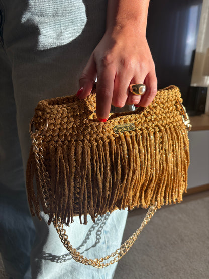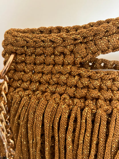Fait main avec un fil polyester et lurex 5 mm, il allie souplesse, solidité et brillance subtile. Ses franges fluides et sa chaîne dorée lui donnent une allure à la fois chic et audacieuse — parfait pour illuminer vos tenues, du quotidien aux soirées d'été.